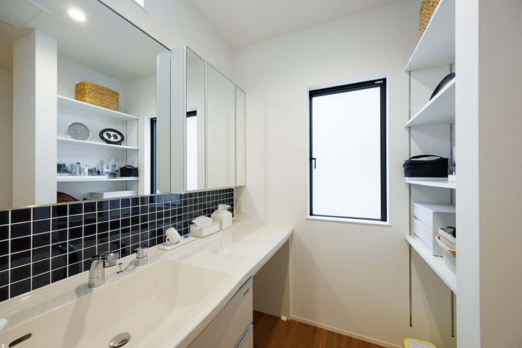 土間収納を兼ねた家族玄関のとなりに、独立洗面台を配置しました。 幅1.65mと幅広タイプで、背面には収納も確保。 帰宅後の手洗いも、朝の身支度もスムーズにととのいます。