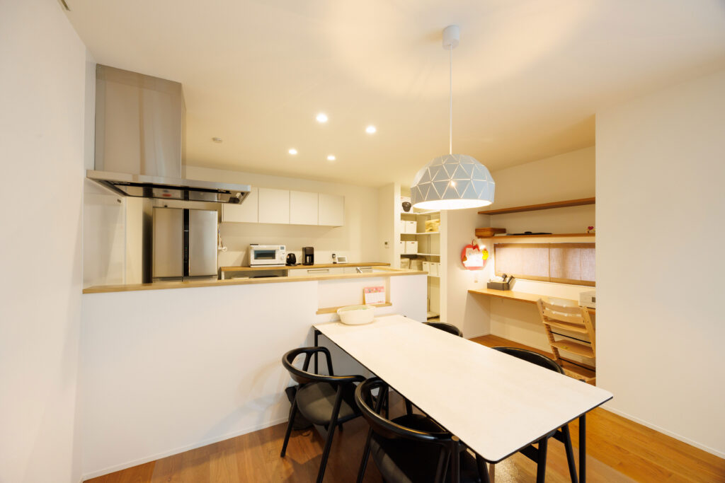 料理と洗濯を同時に進める“ながら家事”をしやすく。 ダイニングスペースの一角にはカウンターを設け、お子さまの学習もお料理しながら見守れます。