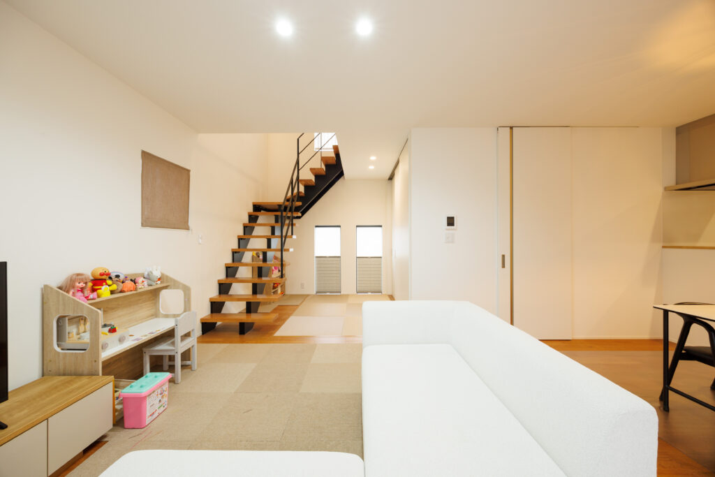 畳コーナーを合わせると約22帖のLDK。 大きな掃き出し窓から続く軒下テラスは、開放感と落ちつきが調和するくつろげる空間。