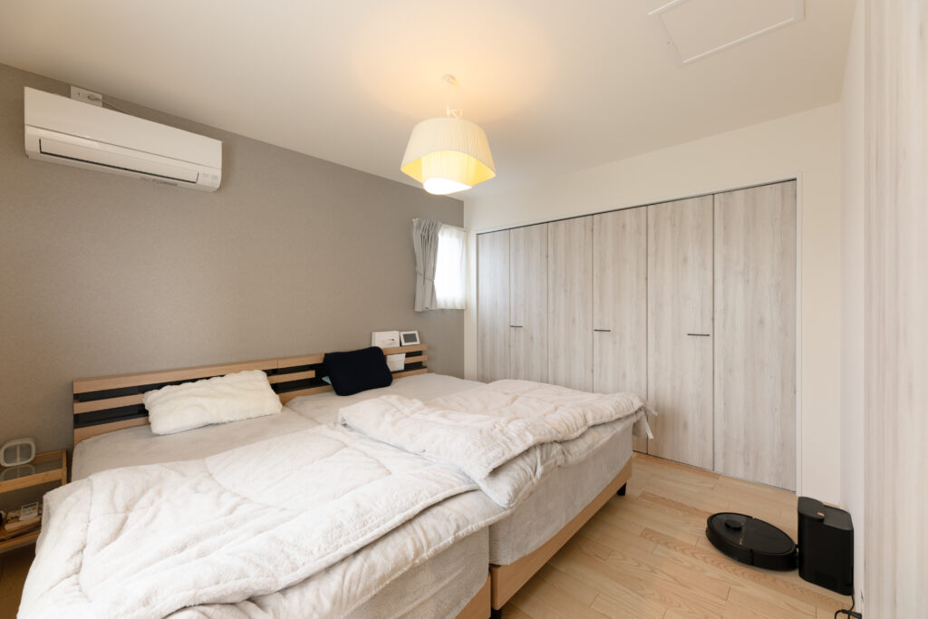 個室を確保するため、寝室はコンパクトに設計しつつ、収納は十分に。落ち着きのあるクロスで、ゆったりと過ごせる心地よさを大切にしています。