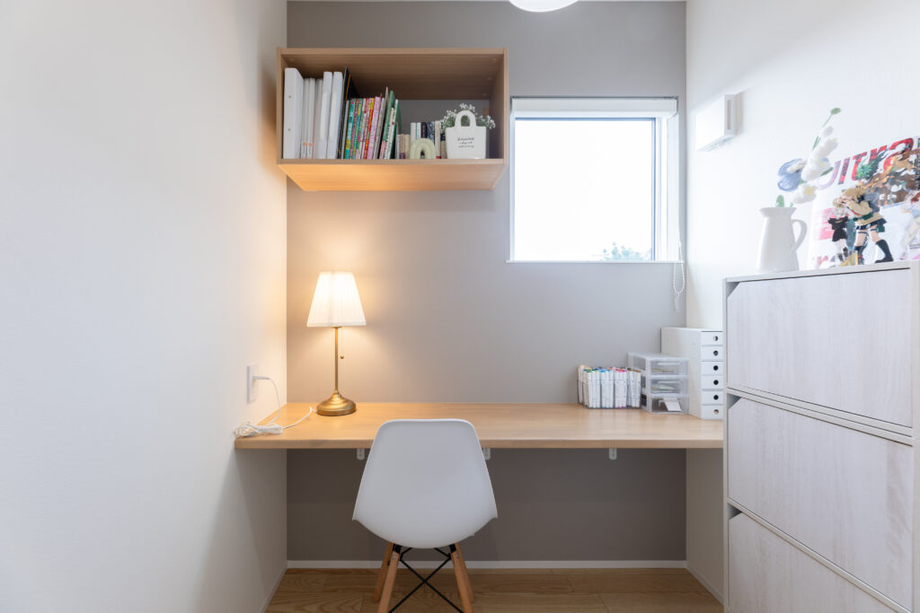 1階・2階それぞれに2帖の書斎を配置。カウンターと造作棚を備え、作業や趣味に集中できる、こもり感のある個室としました。