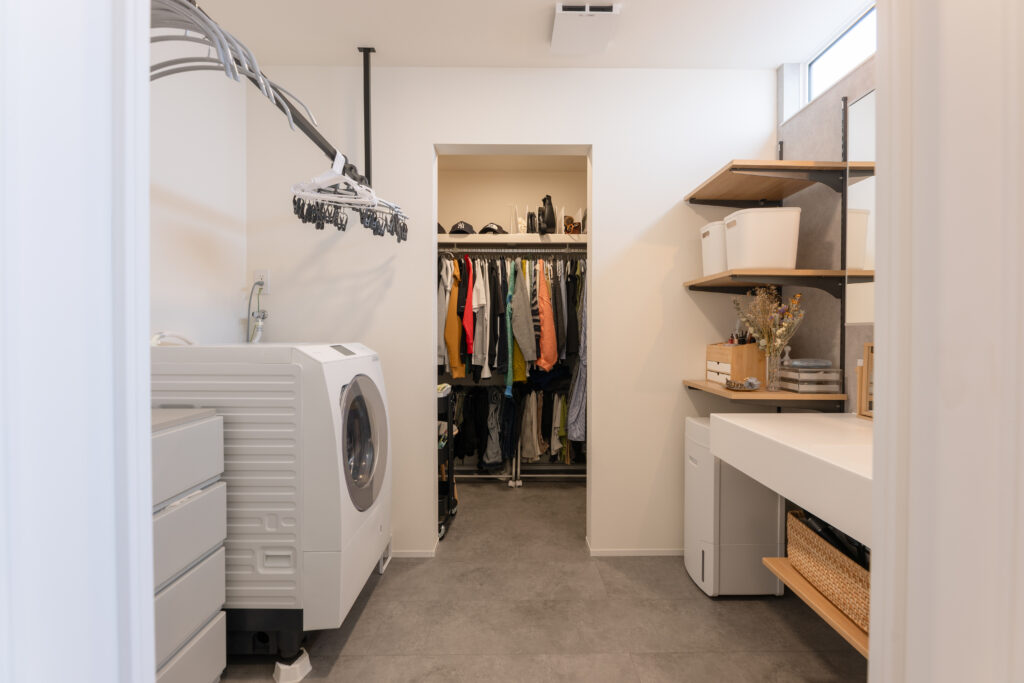 キッチンの横に、洗面室兼ドライルームからファミリークローゼットへとつながる動線を。家事を並行して進められる工夫が、暮らしにゆとりを生み出します。