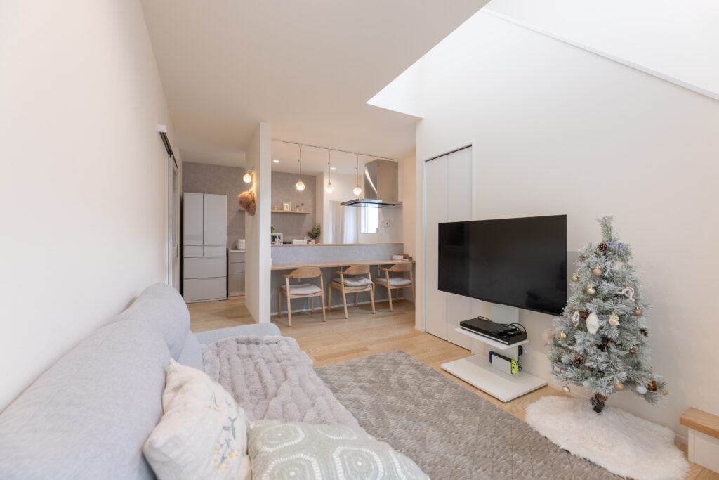ダイニングを省いた14.8帖のキッチン+リビング。吹き抜けから光が降り注ぎ、コンパクトながらも明るく開放感のある空間です。