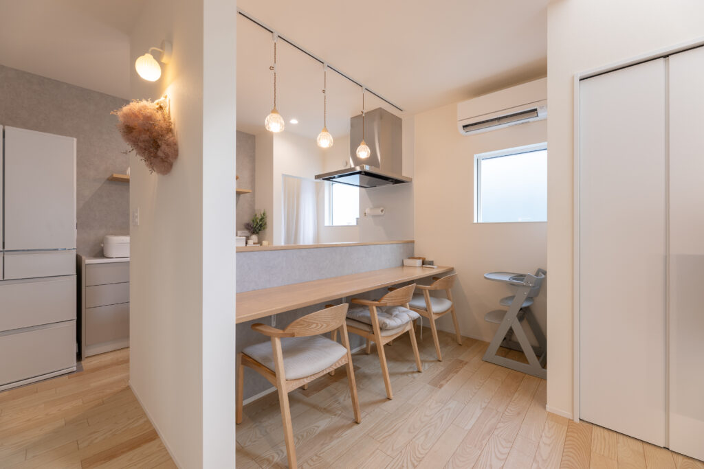 対面キッチンは下がり戸棚を設けず、換気扇を高い位置に配置。カウンター上にゆとりを持たせ、視線が抜ける、圧迫感の少ない空間としました。