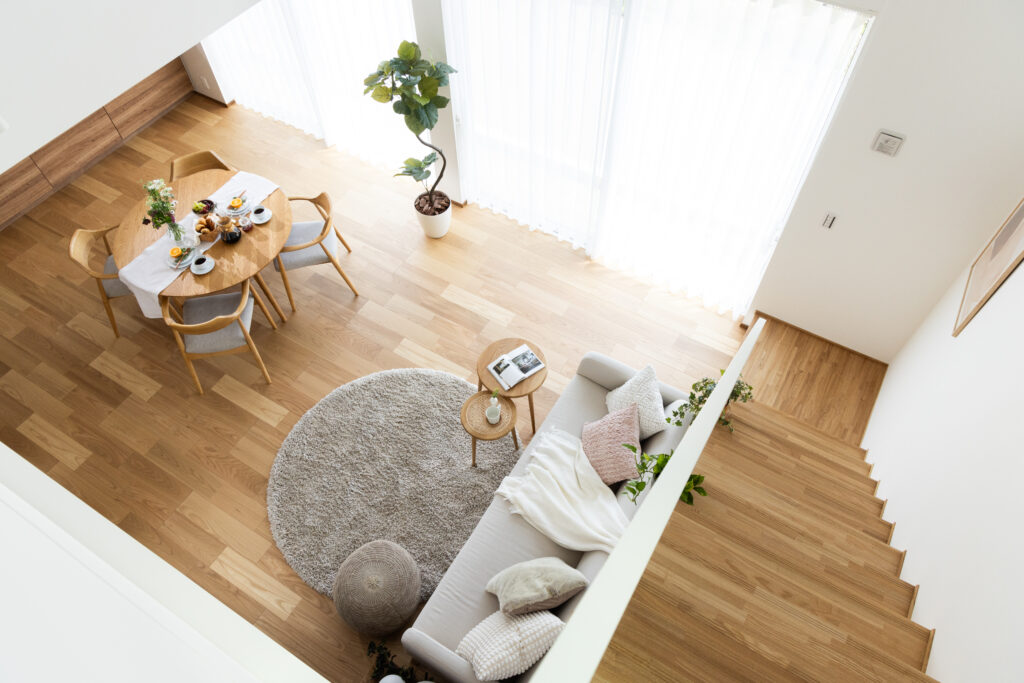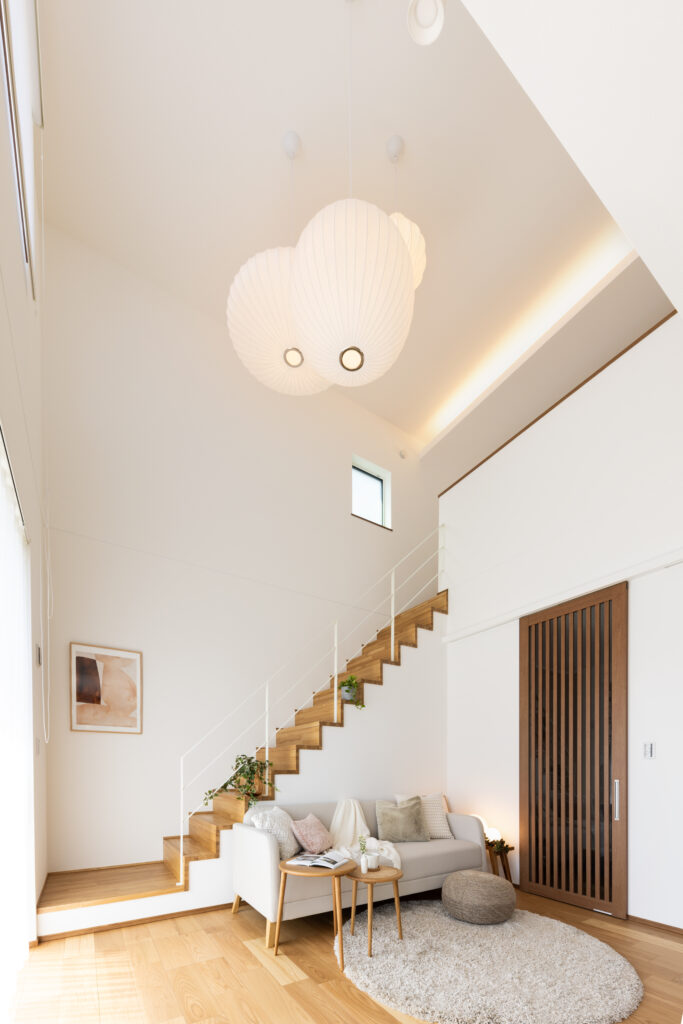 リビング上部の吹き抜けとアイアン手すりのリビング階段で、LDKに実寸以上の開放感が生まれます。