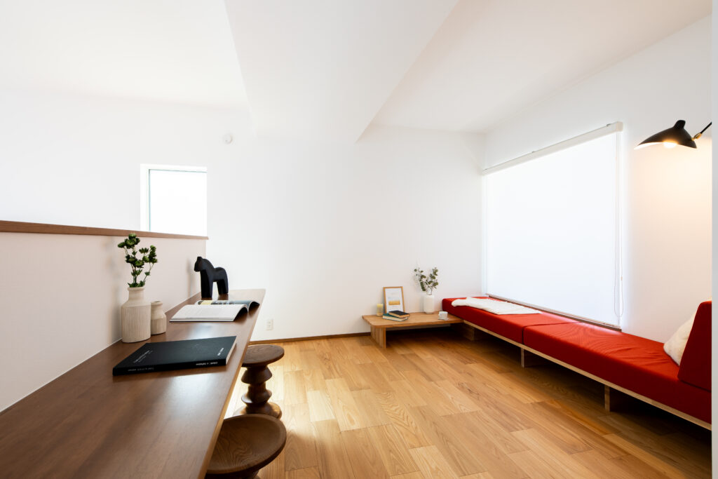 窓際にはこもり感のあるヌックを設置。 向かいにはカウンターを設け、読書や学習など自分時間に集中できる空間をつくりました。
