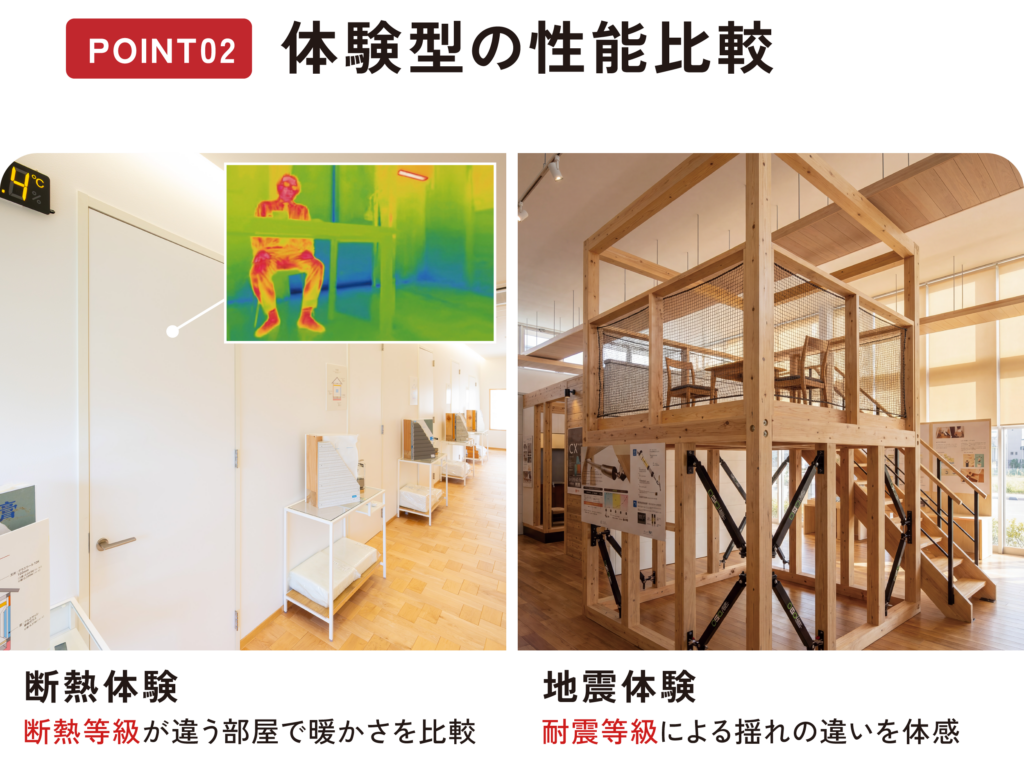 断熱性能による室内の温度差や、耐震性能による揺れ方の違いなど、数値や言葉だけではわからないリアルな性能差を実際に体感できます。