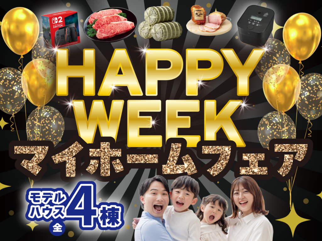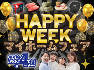 全4棟のモデルハウスを見学できるマイホームフェアを開催!豪華景品が当たるガラポン抽選会や、お得なおむつ販売会など、楽しみいっぱいの企画をご用意。家づくりのことを、気軽に楽しくご相談いただけます。
