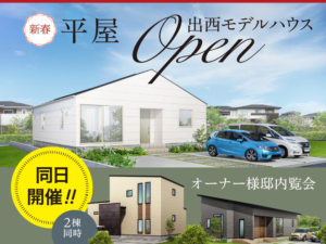 出雲市斐川町出西に平屋のモデルハウスがOPEN!オーナー様のお住まい2棟の内覧会も同時開催!