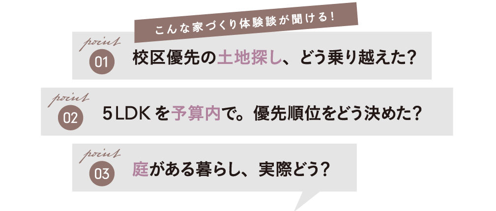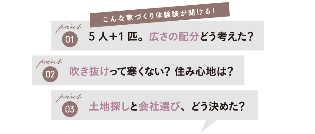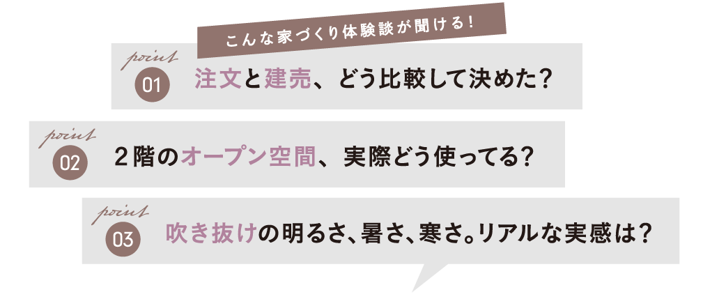 図面だけでは分からない、リアルな住み心地や暮らしの工夫をオーナー様に直接お聞きいただけます。