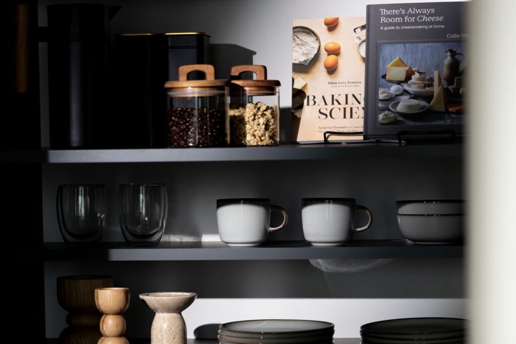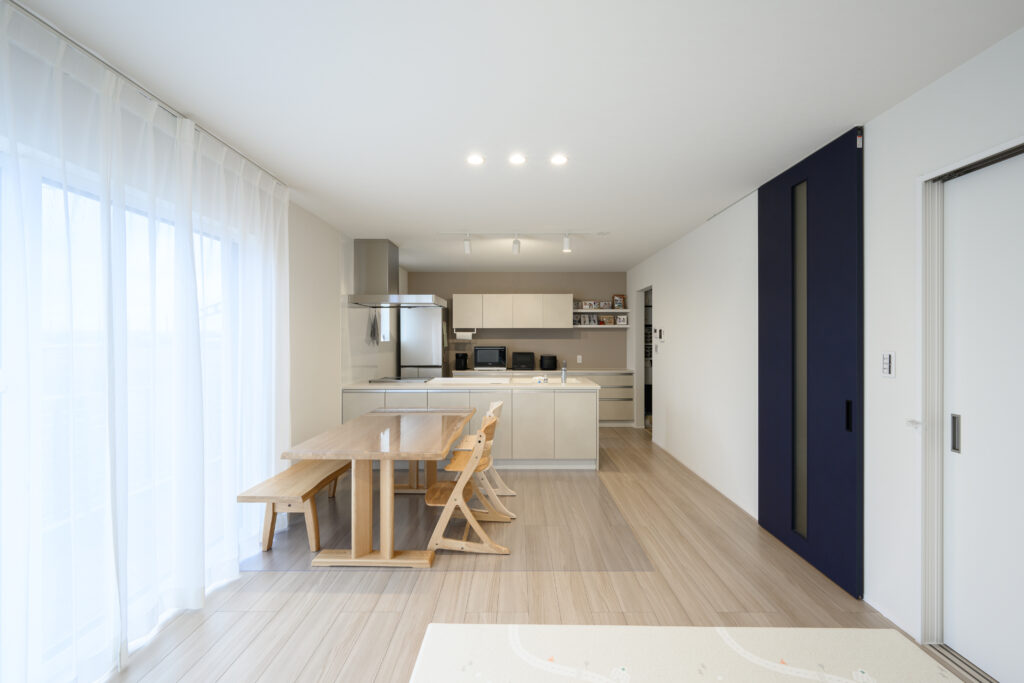 大容量パントリ―と全面収納のキッチン。クロスや扉などLDK全体の色合わせもお気に入りです。