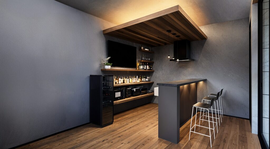 中庭を望む8帖の洋室はホームバー専用ルーム。木張りの下がり天井と一体感のあるバーカウンターや間接照明など、家族や友人と過ごす落ち着いた大人の時間を豊かに演出しています。