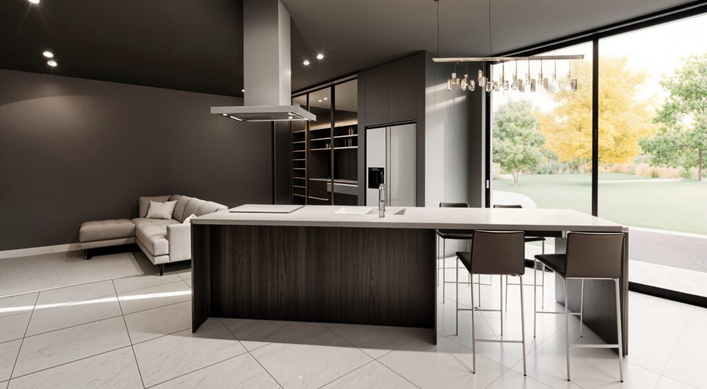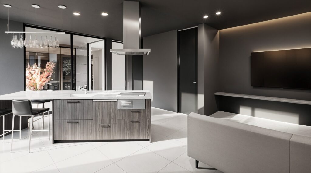 床はフロアタイル、冷蔵庫や収納は凸凹のない埋め込み式でスタイリッシュに仕上げた約23帖のLDK。食事カウンターのあるアイランドキッチンを大胆に斜めに配置し、空間にアクセントを添えています。