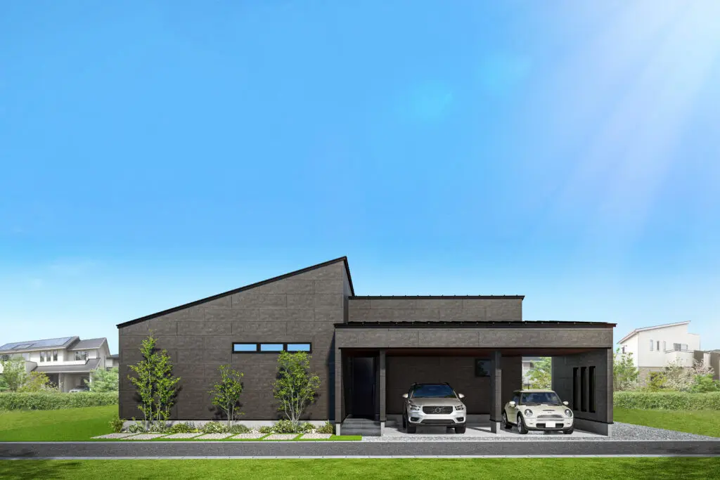 水平ラインが美しいスタイリッシュな外観デザイン。ゆったり2台収容できる、インナーガレージのある平屋プランです。玄関アプローチはガレージと一体化し、雨や雪の日も濡れることなく、荷物の出し入れもスムーズに。室内はホテルライクでスタイリッシュな空間。デザイン性と機能性にこだわりぬいた本物志向の住まいスタイルをごらんください。