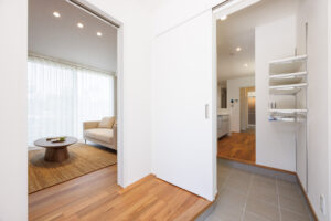 玄関のシューズクローゼットからパントリー、キッチンへと一直線にアクセス。買い物帰りもスムーズに収納できます。キッチン横にはウォークインクローゼットも設け、洗濯・収納・炊事の効率を高めた家事ラク動線です。