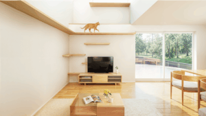 吹き抜けにキャットウォークを設けた、ねこと人のためのリビング。開放感のある空間で、ねこは自由に、人は伸びやかに過ごせます。ねこの習性にも配慮し、ねこと人、どちらにも居心地のいい❝ちょうどいい距離❞をデザインした住まいスタイルをご参考にしてください。