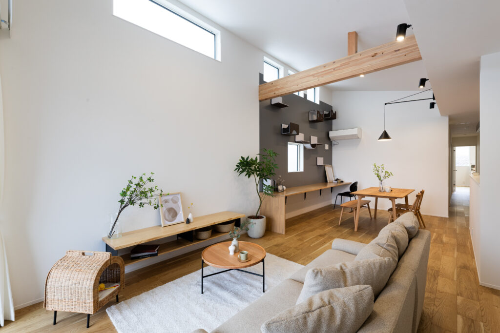 2方向にキャットウォークを設けた吹きぬけリビングはねこがのびのび動ける立体空間。造作ソファを組み込んだくつろぎのリビングは、2階ホールともゆるやかにつながり、家族の気配を感じられる心地よい空間です。