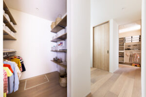 家族玄関から直結する4.5帖のファミリークローゼット。洗面、ドライルーム、キッチン・パントリーへとつながり、帰宅後の着替えや買物の片づけもスムーズに行えます。