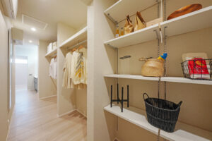 玄関から洗面室、ファミリークローゼット、リビングへとつながるスムーズな動線設計。帰宅後すぐに手洗いや片付けができ、生活のしやすさと清潔な習慣を両立します。