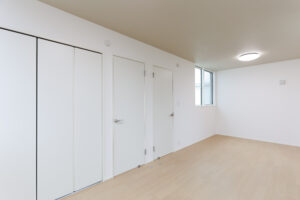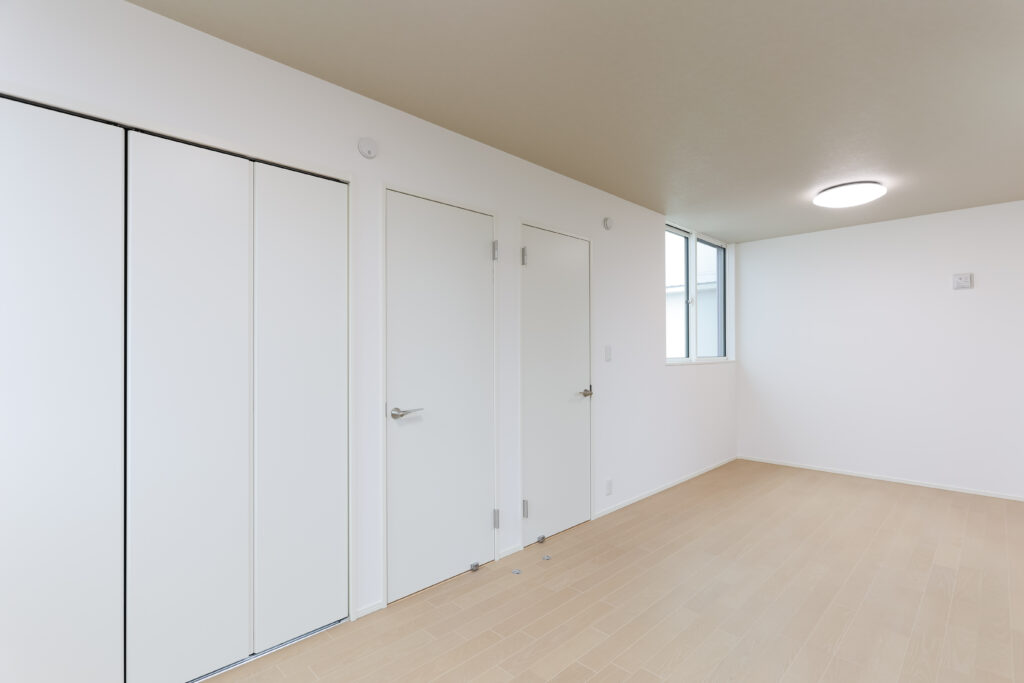 寝室は家の奥に配置し、落ち着いて過ごせるプライベートな空間に。近くに洗面、ドライルーム、トイレをまとめ、家事も日常も効率よく。将来ご夫婦だけの暮らしになっても快適に暮らせる設計です。