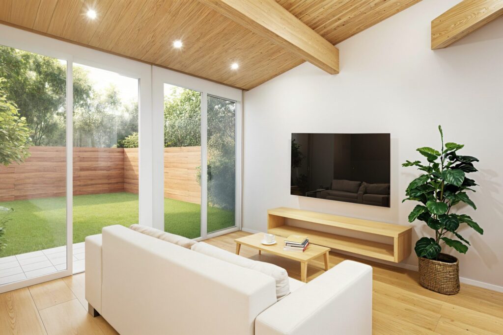 東側に天井いっぱいの窓を設けたリビングは、視線が外へ抜け、上方向にも勾配天井が広がる、明るく開放的な空間。テラスや庭ともつながり、自然と家族が集まる居心地のいい場所になりました。近い距離感で、家族時間をゆったり育む、子育て世代の平屋スタイルです。