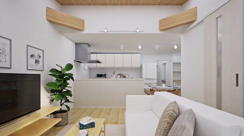 キッチンとダイニングを横並びに配置したL字型LDKは、配膳や片付けもスムーズ。リビング横にはスタディースペースを設け、家事をしながら子どもを見守れます。