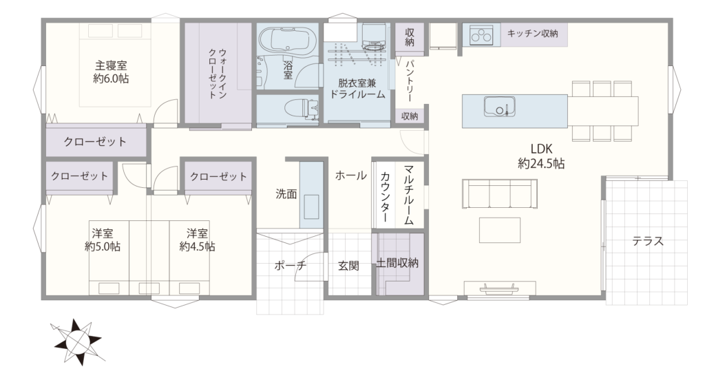 LDKを大きなひとつの空間として確保しながら、居室は距離を取ってゾーニングした平屋では、開放感とプライベート性を両立。広がりのあるLDKと落ち着いた個室、それぞれの心地よさを楽しめます。