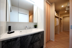 土間収納付きのファミリー玄関からは、リビングフロアを通らずに洗面室や浴室、クローゼットへ向かう動線を確保。外出先から帰ってすぐに手を洗ったり着替えたりできるので感染症対策ができ、お子様の衛生習慣も自然と身につきます。パントリーやキッチンへもつながっているので、買い物帰りの収納がとっても楽。LDKが散らかりにくく、すっきりキープできます。