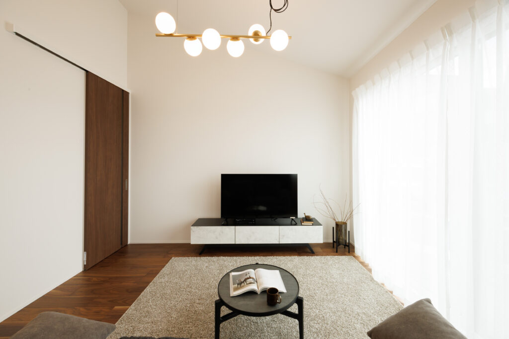 勾配天井が生み出す開放感あふれるリビング。空間の広さと心地よさを感じながら、ゆったりとくつろげます。