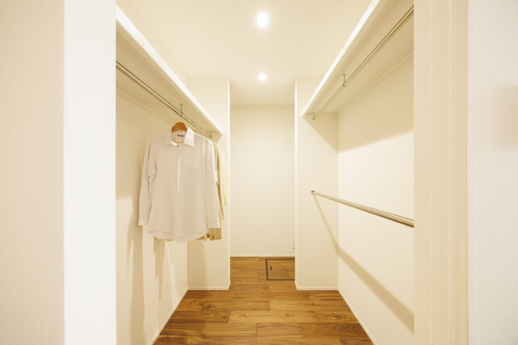 家族みんなの衣類や荷物をまとめて収納できる、大容量のファミリークローゼットを配置。日用品もすっきり収まり、住まいをきれいに保てます。