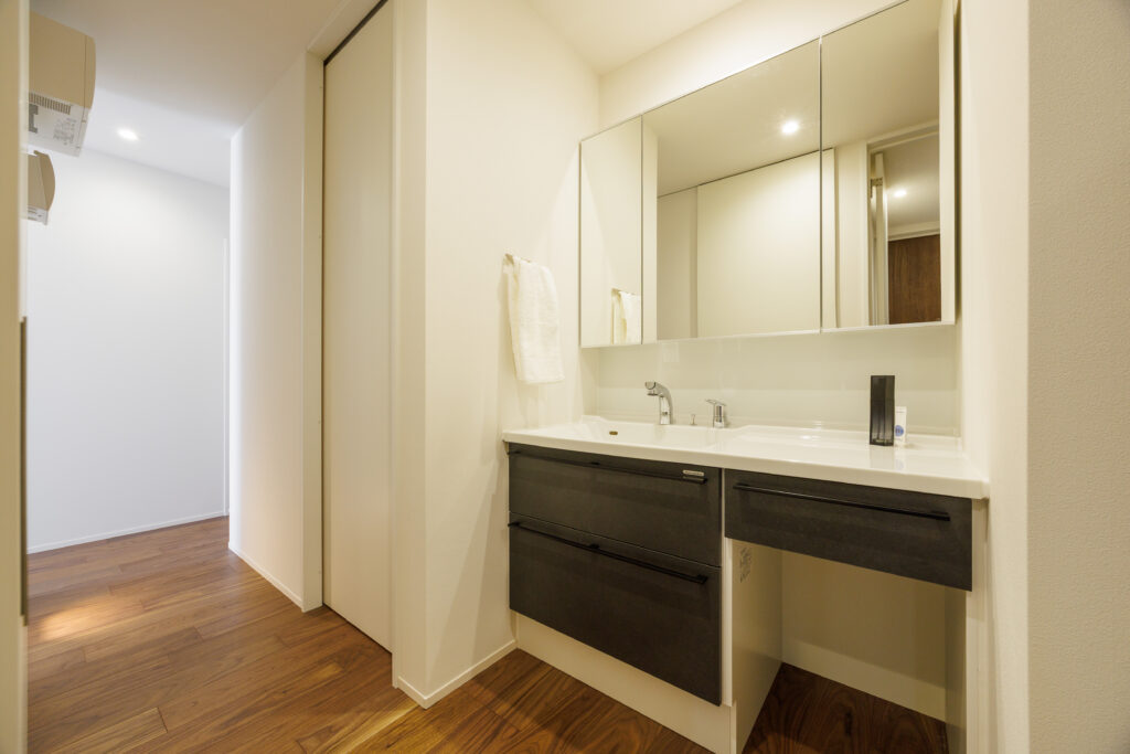 横幅の広い洗面台を採用し、朝の身支度もゆったり。家族が並んで使えるため、忙しい朝の混雑もスムーズに解消してくれます。