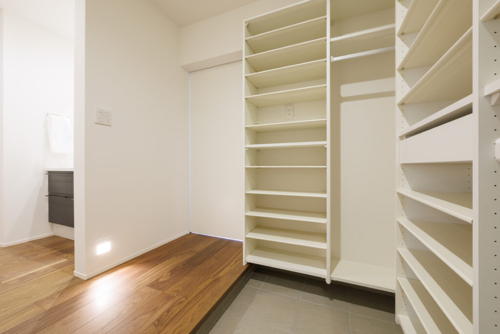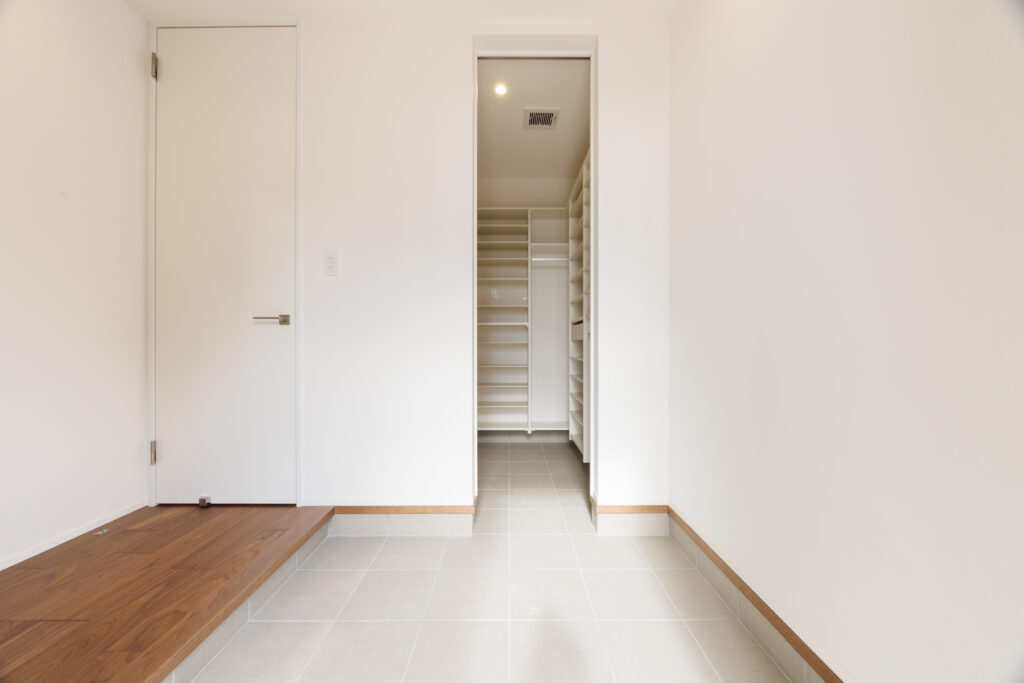 来客用と家族用に2つに分かれた帰宅動線で、玄関まわりはいつもスッキリ。4人家族の履き物も、余裕を持って収納できます。
