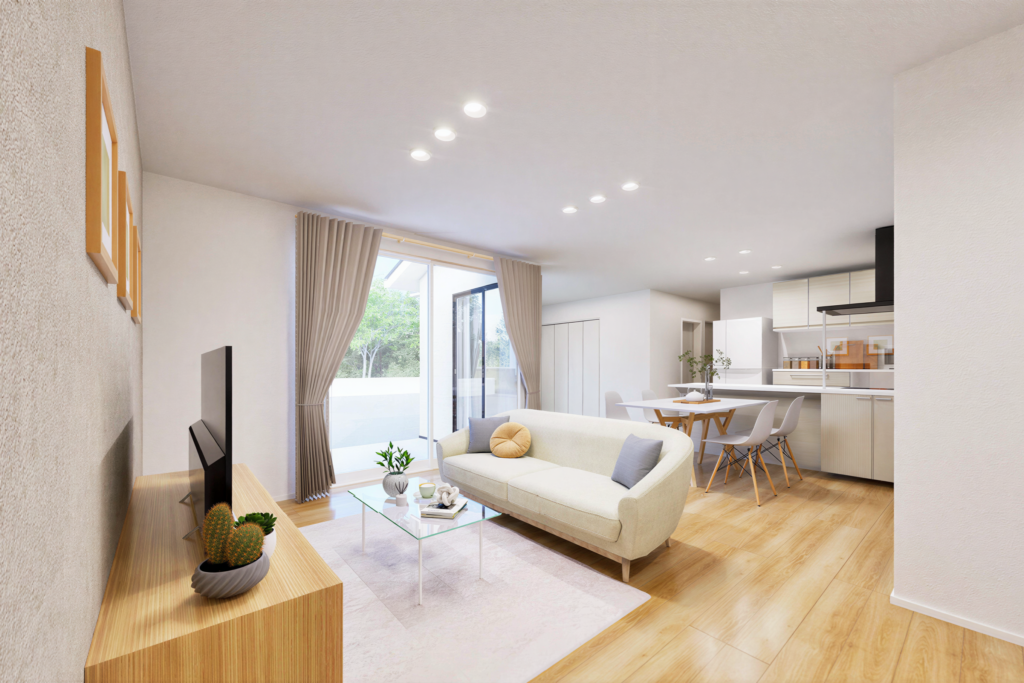 17.5帖のLDKに隣接する4.5帖の畳コーナーをフラットにつなぎ、空間を一体化。リビングと畳コーナーの両側からテラスへつながる大きな窓が、外へと視線を抜き、実際以上の広がりを感じさせます。