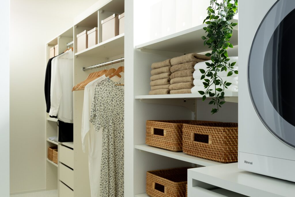 玄関からパントリー、キッチンへとつながり、買物後の収納もスムーズに。さらに洗濯室・ファミリークロゼットへ回遊できる動線で、「洗う・干す・しまう」を一連の流れで完結。ハンガーのまま収納できる効率的な家事動線を実現しました。