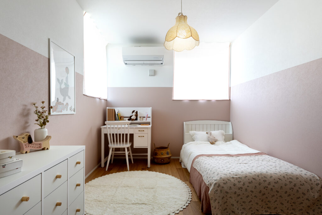 居室は家の奥側にまとめ、プライバシーに配慮した配置に。子ども部屋は3室確保し、それぞれに収納も完備しました。家族構成の変化に対応できる設計で、長く快適に暮らせます。