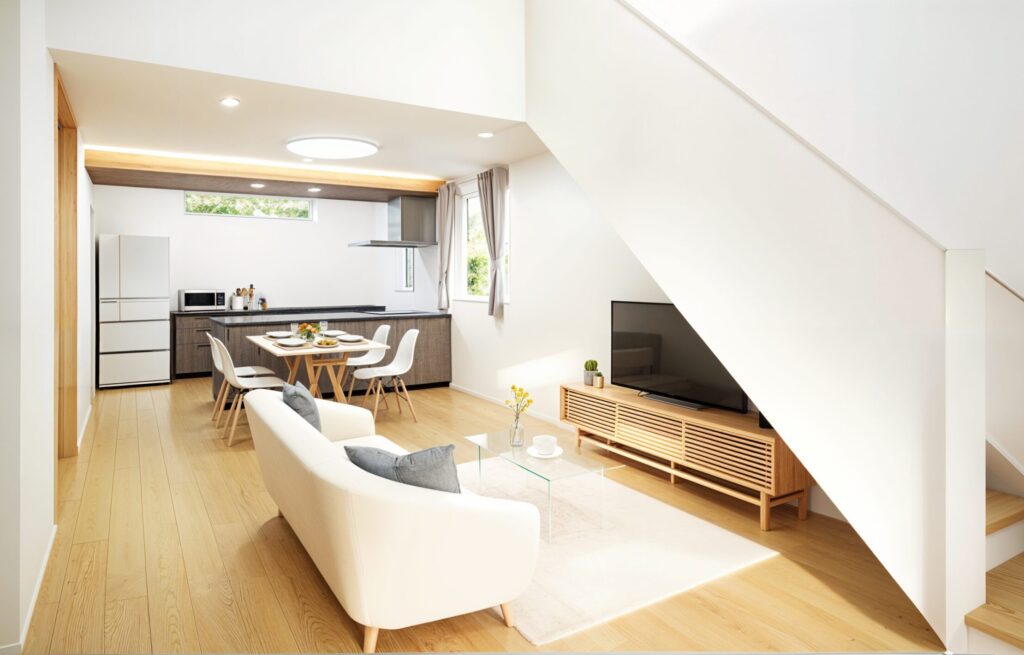 6帖の吹き抜けとリビング階段がつくる、明るく開放的な空間。階段の奥には壁付けテレビを設置し、余白までも家族が自然と集う場にデザインしました。設計のアイデアで、実寸以上の広がりと心地よさを感じるくつろぎの空間をご体感ください。