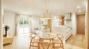「食べる」と「くつろぐ」をゆるやかに分けたLDK。フラットな畳コーナーとつながり、家族それぞれの時間が思い思いに広がる大空間です。ダイニングで、ソファで、畳で。心地よさのかたちを自由に選べる、ゆったりとしたリビングデザインをご体感ください。