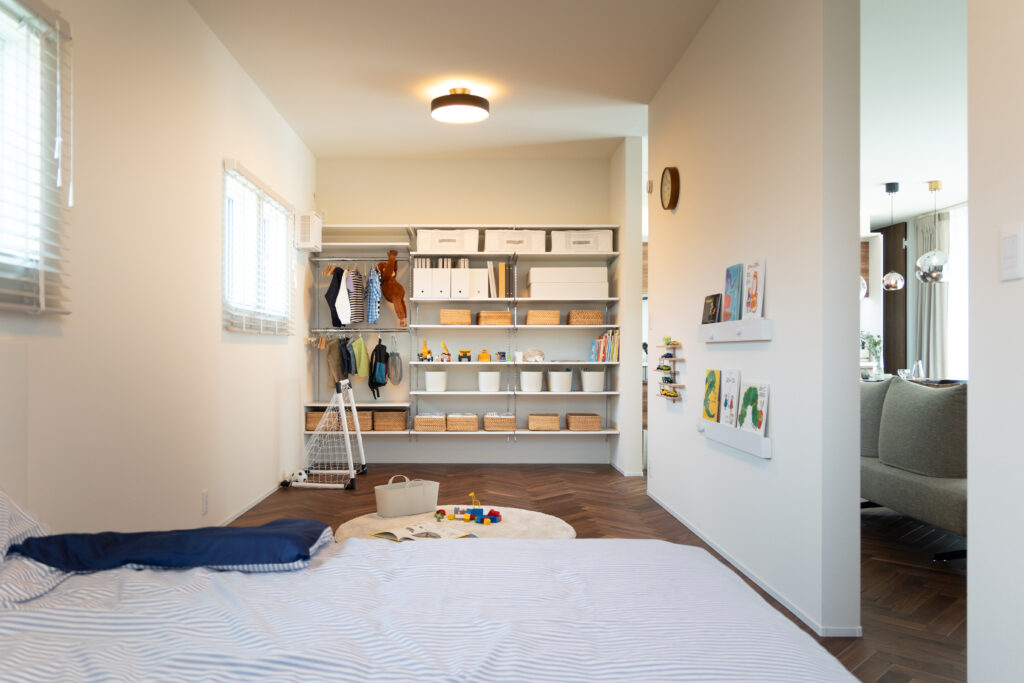 寝室や子ども室はリビングの奥に配置し、家族のプライバシーにも配慮。子ども室は将来の間仕切りも可能で、成長に合わせて間取りを柔軟に変えられる設計です。