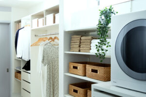 キッチンの背面にドライルームを設け、ドライルーム⇒ウォークインクローゼット⇒納戸⇒寝室を一直線に結びました。炊事・洗濯・片づけ・就寝準備まで、毎日の暮らしを快適にする動線です。