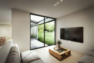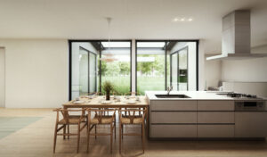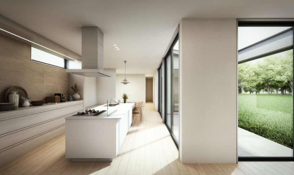 コの字テラスに面したリビングには、穏やかな光が差し込みます。キッチン・ダイニングとゾーンを分け、落ち着きのある特別な寛ぎのひとときを生み出します。