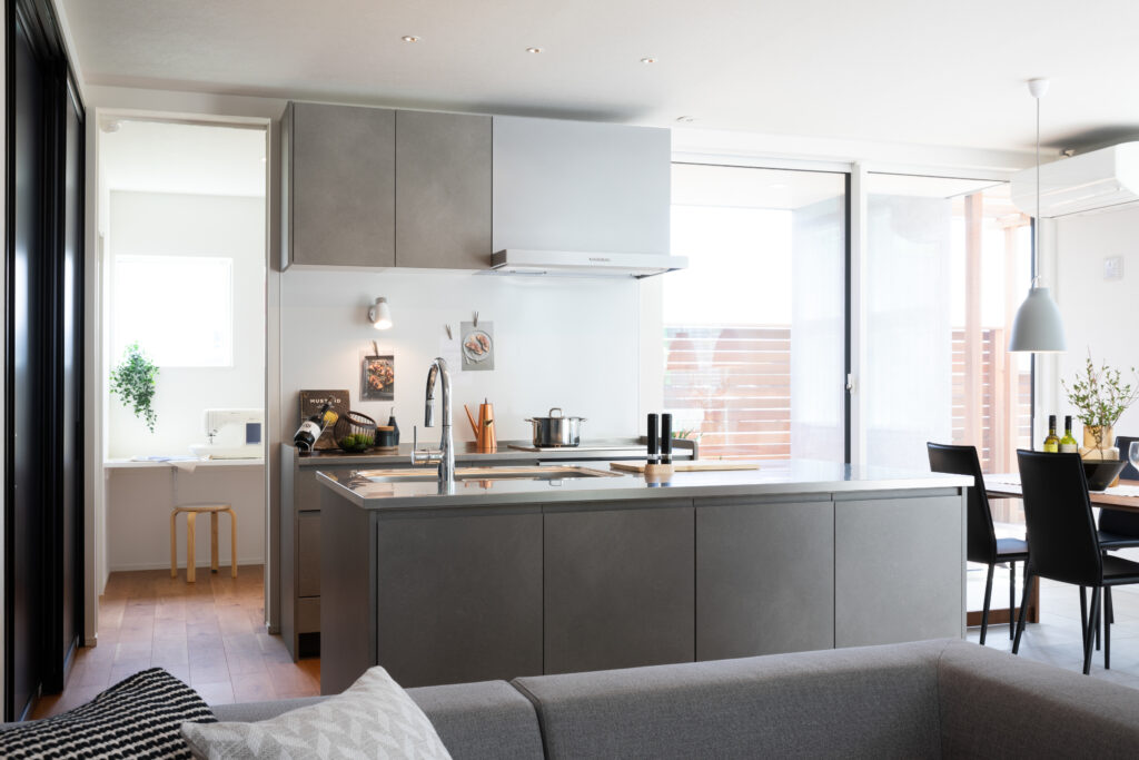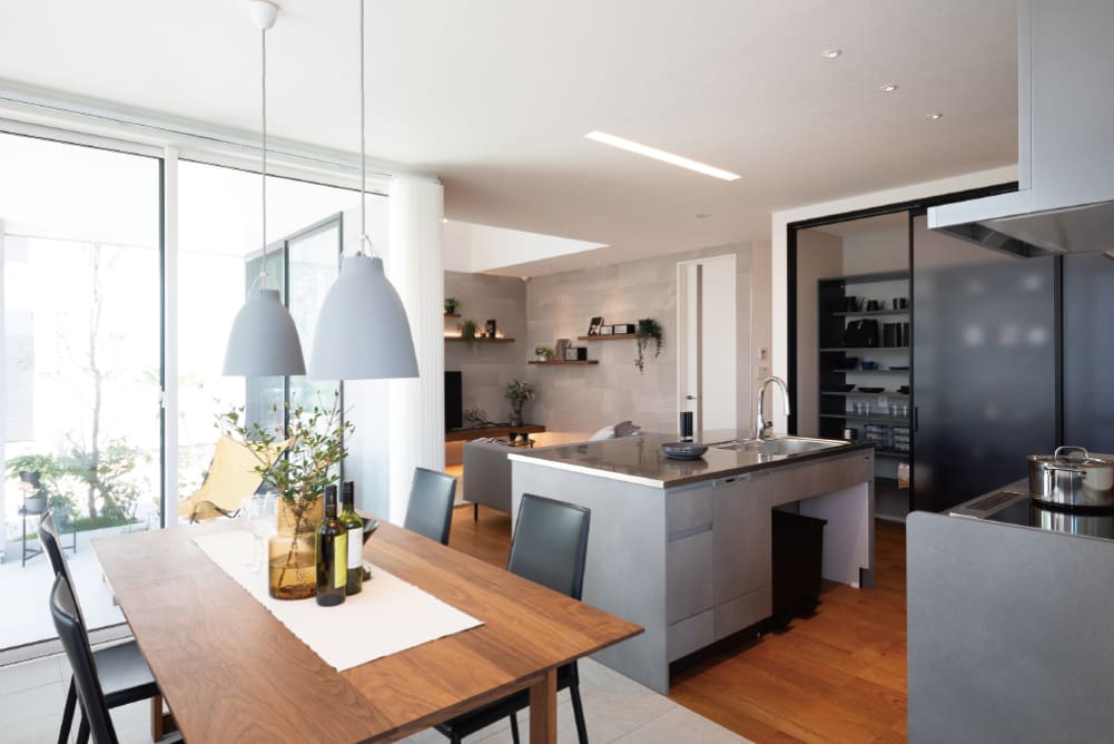 家族で料理が楽しめる2列型キッチン。「食べる」と「くつろぐ」をゆるやかに分けたLDK。LDKの続きには用途の違う2つのデッキ。家族の日常をいちばんに考えた心地よさと機能性を追求した住まいです。