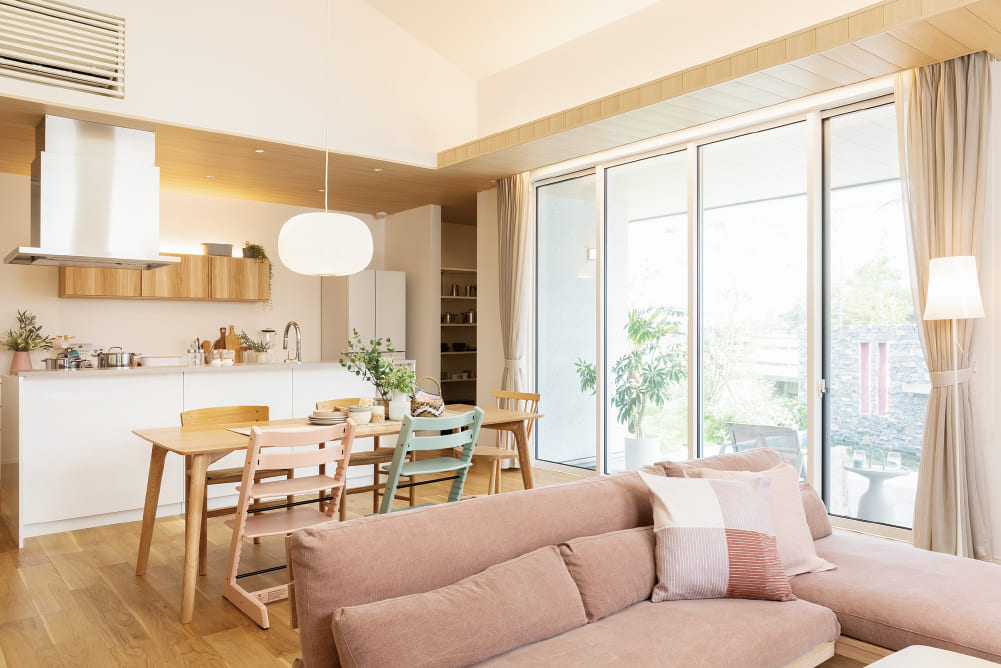 リビング・ダイニング・キッチンの空間設計で「くつろぐ」「食べる」をゆるやかに分けました。リビング・ダイニングから続く軒のあるタイルデッキはアウトドアリビングとしておうち時間を豊かに育みます。