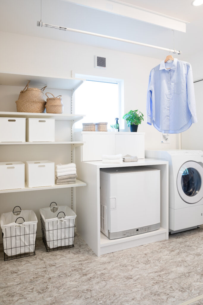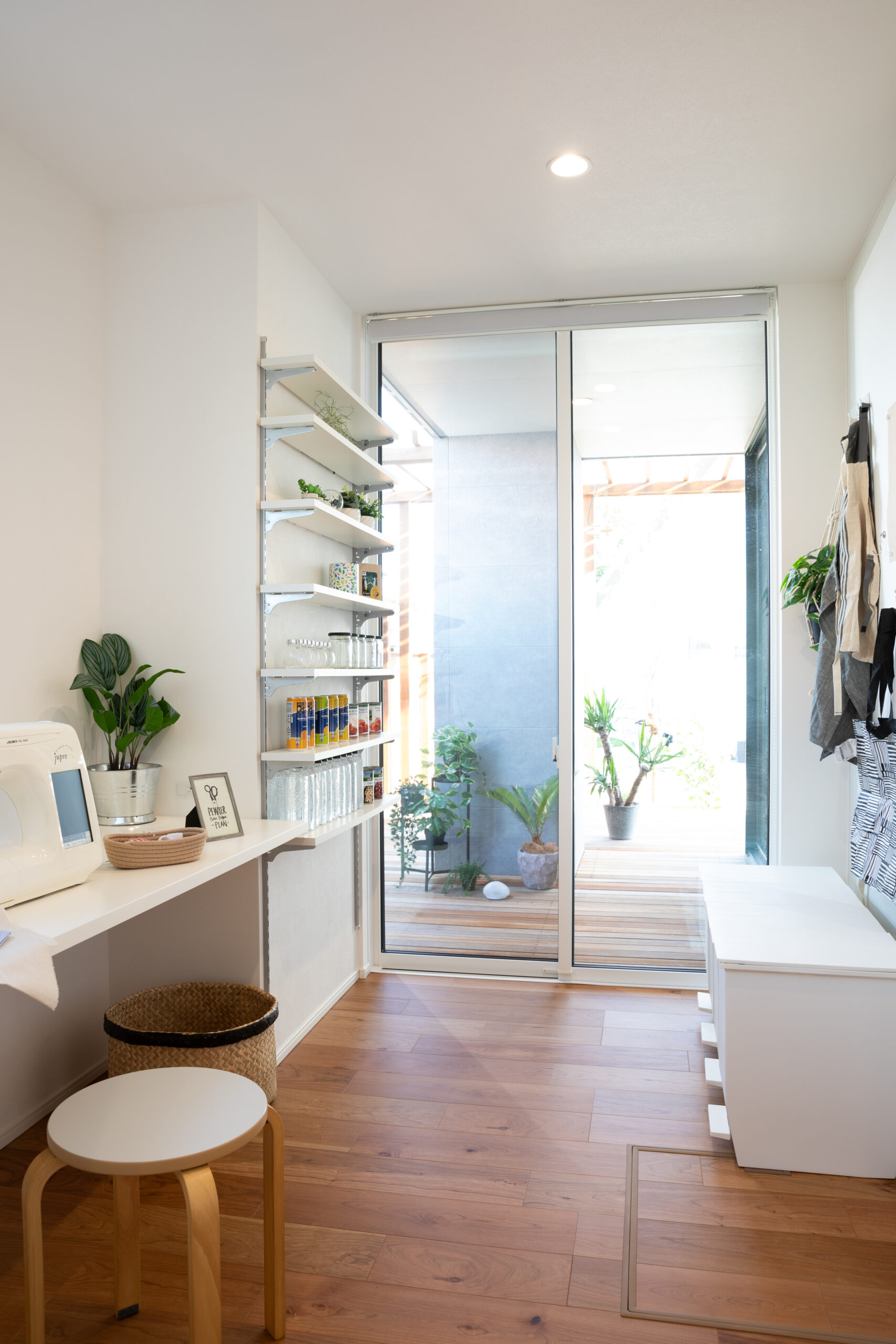 ウッドデッキとつながる洗濯室と家事室。ウッドデッキは、晴れた日ならシーツなど大物も干せる物干しスペースに。プランターを置けば家庭菜園も楽しめます。