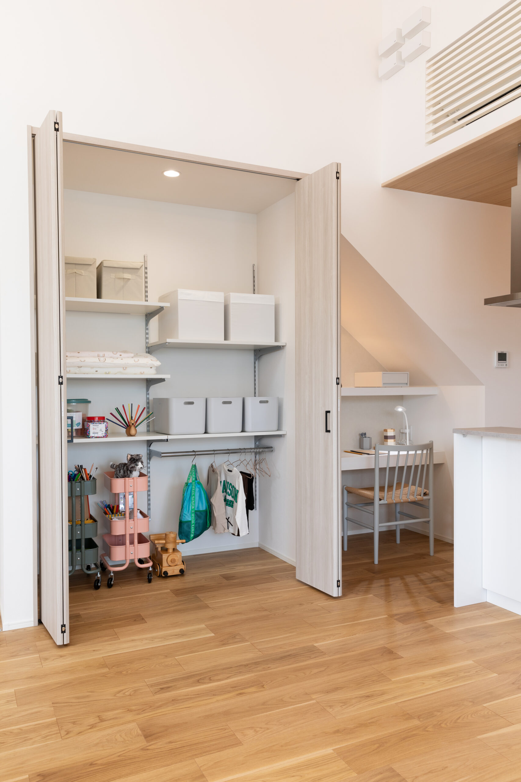 家中を見渡せるアイランドキッチン周辺には、買い置きに便利な大容量のパントリー、お子さんの学校のお便りも貼り出せる壁など、収納・整理に便利な工夫が散りばめられています。