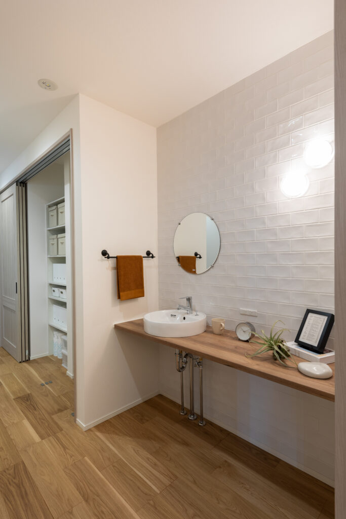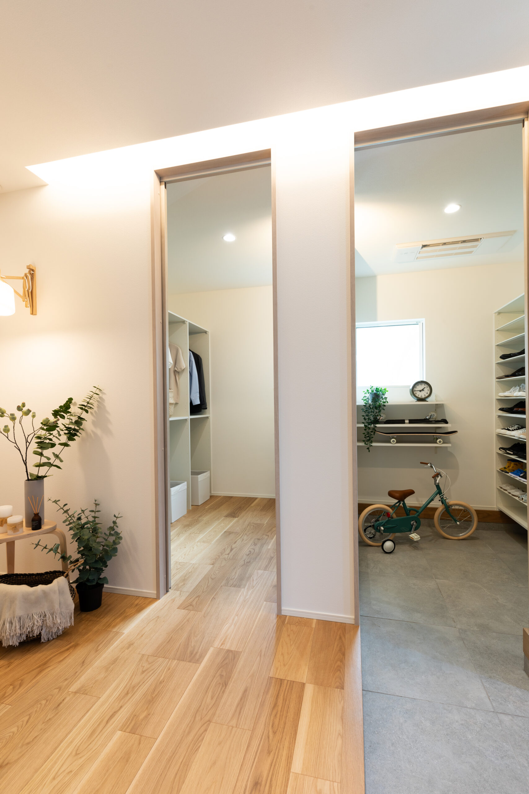 玄関の土間収納に隣接してウォークインクローゼットを配置し、さらに洗面室への動線をつなげました。忙しい朝に着替えと洗面が最短でできる嬉しい工夫です。