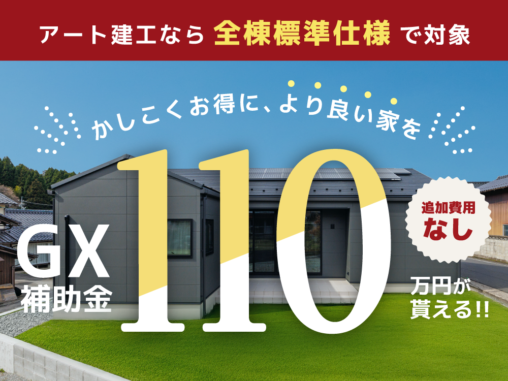 アート建工の家なら全棟標準仕様でGX補助金対象!110万円の補助金ももらえて、より良い家が建てられる。いいことづくしの補助金制度を活用しよう!