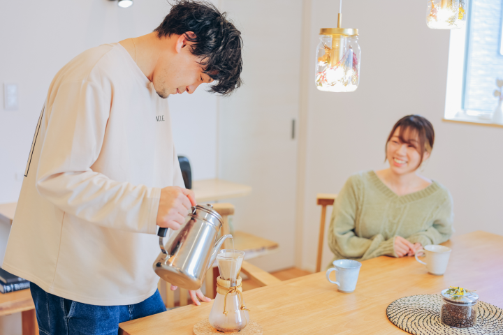 「結婚して子どもが生まれたら温もりのある木の一軒家を建てたい」それがおふたりの夢だったそう。夫は妻のためにコーヒー豆を挽き、ゆっくりと時間をかけてハンドドリップする。妻は自分で育てたグリーンで部屋中を彩る。夫婦でキッチンに立ちながら、目線の先に子どもたちが遊び回れる広いリビングがある。そして、休日には庭先でバーベキューも楽しんで……そんなささやかな幸せが毎日ずっと続く家を、丁寧にかたちにしていきました。